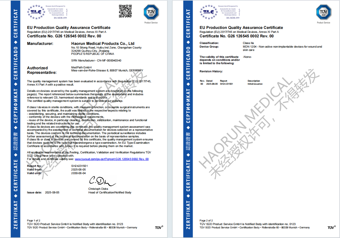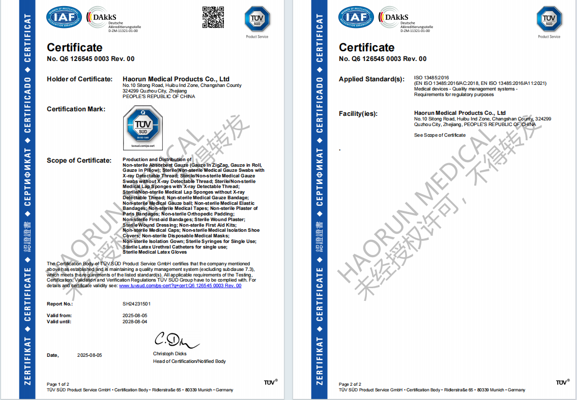 Per migliorare ulteriormente la qualità, abbiamo completato la pubblicazione del nostro manuale della qualità e dei documenti procedurali nel settembre 2023. Sulla base di ciò, abbiamo migliorato i documenti del nostro sistema di gestione della qualità nel gennaio 2024, aggiungendo contenuti relativi all'MDR. Abbiamo superato la prima fase dell'audit TUV SUD il 10 aprile 2025, e poi la seconda fase. Infine, nell'agosto di quest'anno, il nostro numero di certificato è diventato disponibile per la visualizzazione nel sistema dell'organismo notificato, segnando un nuovo passo avanti nel sistema di gestione della qualità di Haorun Medical e rafforzando le basi dell'azienda per lo sviluppo. I nostri materiali di consumo medici monouso (garze, rotoli di garza, bende di garza, ecc.) forniscono ai clienti di tutto il mondo prodotti e servizi di qualità superiore.