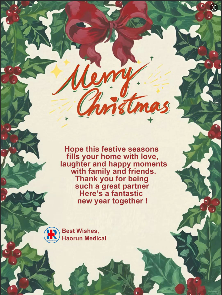 Con l'avvicinarsi del Natale e del nuovo anno, Haorun Medical, attore chiave nel settore del commercio medico globale, porge calorosi auguri di buone feste a tutti i dipendenti, partner, clienti e sostenitori. Questa stagione festiva è un momento di gratitudine e celebrazione, e anche un nuovo punto di partenza per l’azienda per continuare la sua missione di facilitare il flusso di risorse mediche di alta qualità e promuovere lo sviluppo sanitario globale.